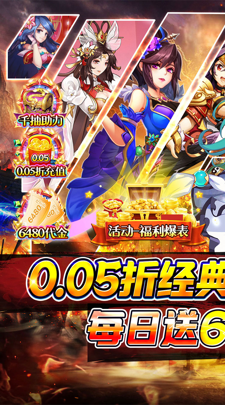 【0.05折扣充值】全场永久充值0.05折,历史名城,经典战役,三国名将; 【福利代金券】每日保底领取6480代金券,可用于元宝充值,礼包购买; 【新角好礼】上线即送名将礼包,海量元宝,丰富道具,海量英雄经验; 【新服活动】新服狂欢,次日登录领取神将“七星-诸葛亮”,7日领取“济世-华佗”; 【千抽福利】通关主线关卡,领取千抽神将令;