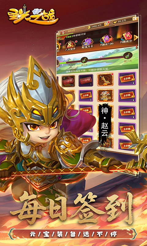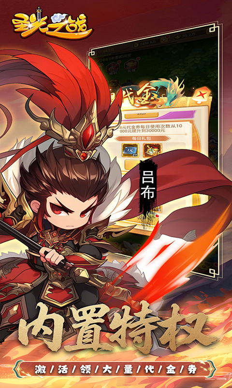 1.终生买断:0.05折买断版本,内置GM工具 2.进游豪礼:进游就送代金券,神将送不停 3.无限代金:内置无限代金券特权,激活每日领免费领大量代金券! 4.免费代金:游戏每日发放代金券,轻松不氪爽完! 5.登录豪礼:海量元宝、极品装备、五星武将、神秘锦囊,登录即送!
