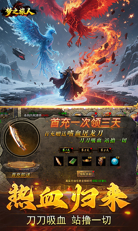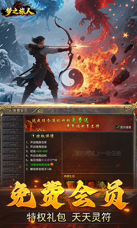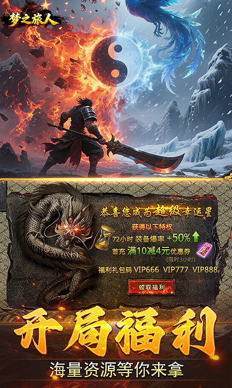★全场充值永久3.5折 ★在线打怪会员免费拉满 ★会员特权福利灵符天天领取 ★装备回收兑换海量充值红包 ★打装备回收得混沌神石可以无限兑换灵符 ★独家礼品码:VIP666、VIP777、VIP888,有海量灵符/充值红包/百万元宝!