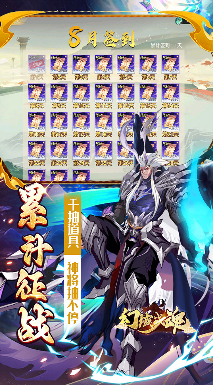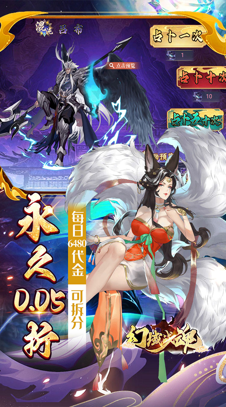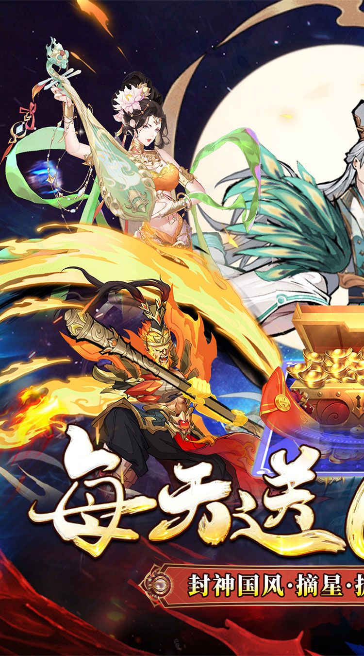 【永久0.05折】永久0.05折,真实一口价,福利更多; 【创角送礼】VIP经验,神将【哪吒】,限定装扮等; 【签到送充】七日签到领千元真充红包,每日上线直送6480代金券; 【代金返利】全新福利,累计充值每天都能领取超值代金券返利; 【满星神将】完成主线送毕业满星神将-丹江口话事人【杨戬】; 【千抽大奖】累计征战获取1000张召唤道具;