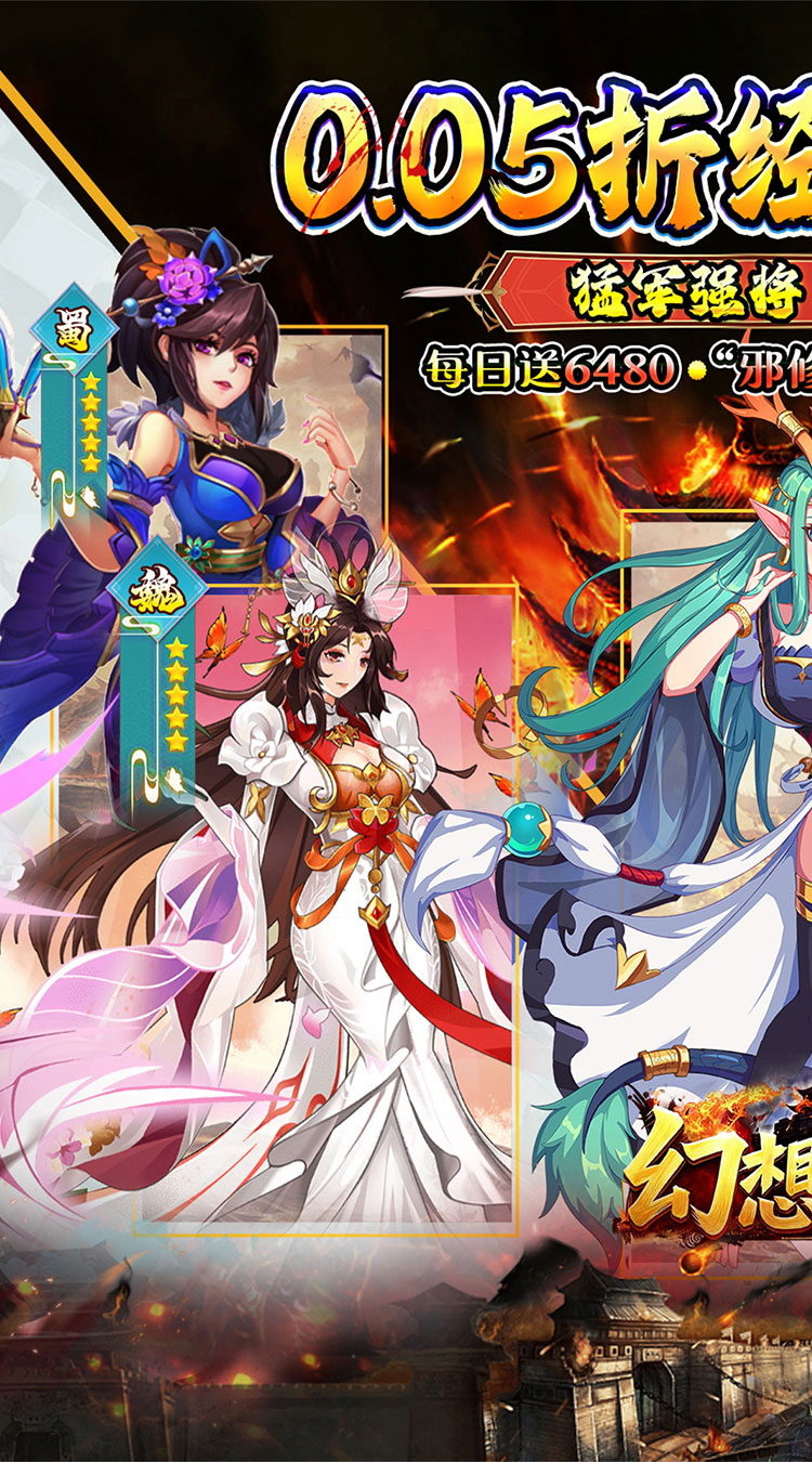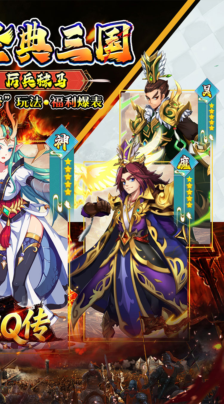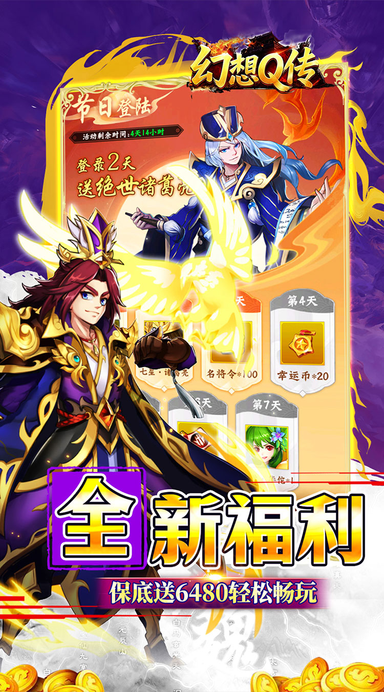 【0.05折扣充值】全场永久充值0.05折,历史名城,经典战役,三国名将; 【福利代金券】每日保底领取6480代金券,可用于元宝充值,礼包购买; 【新角好礼】上线即送名将礼包,海量元宝,丰富道具,海量英雄经验; 【新服活动】新服狂欢,次日登录领取神将“七星-诸葛亮”,7日领取“济世-华佗”; 【千抽福利】通关主线关卡,领取千抽神将令;