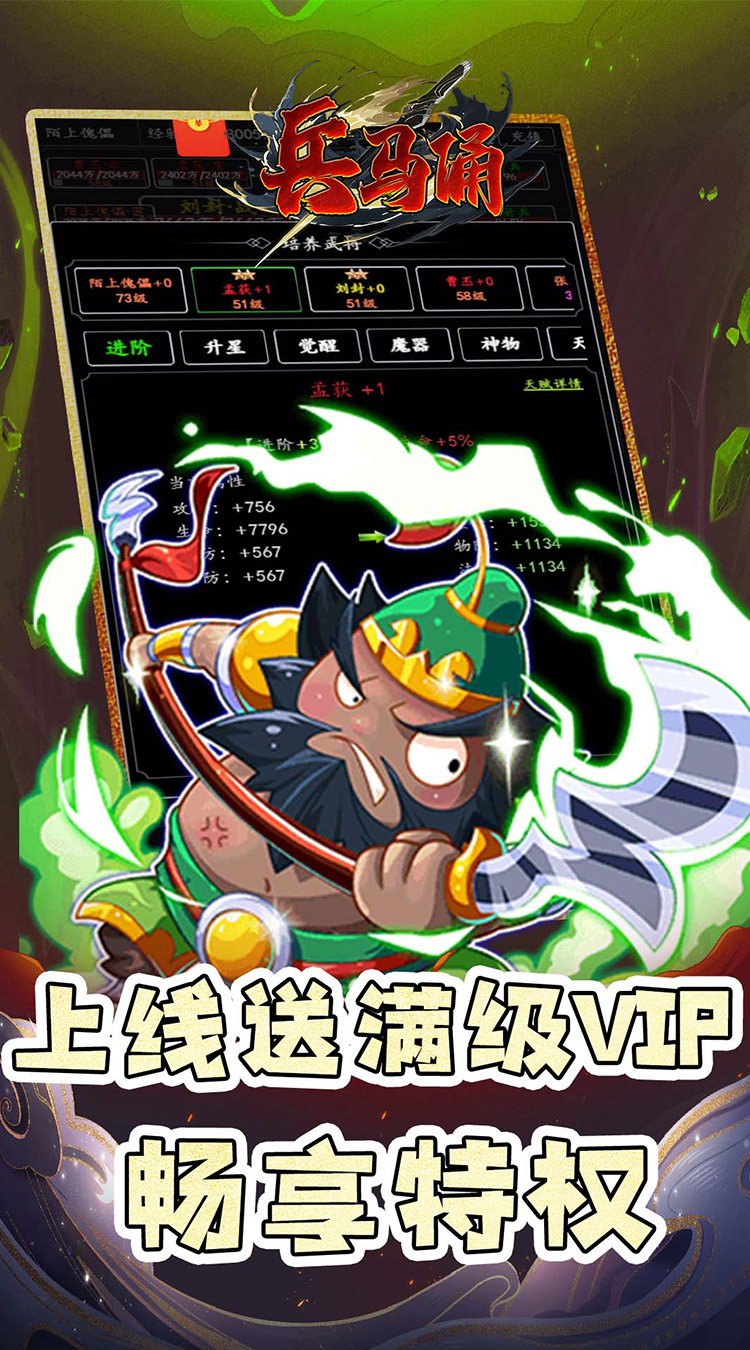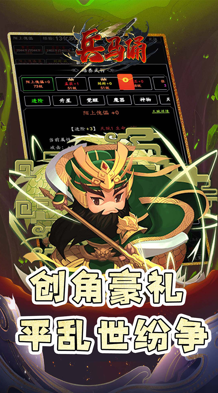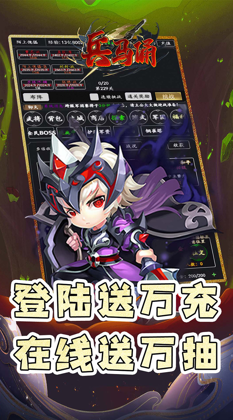 1、全场永久0.05折、上线送10W民心、100武将招募令、100W元宝、500W银两、500W经验 2、上线送VIP修为卡*648,直达顶级VIP18,畅享特权和福利。 3、登陆送万充,在线送万抽、抢红包 4、每日签到送海量资源和豪礼,首充送红将贾诩和无双吕布 5、佛系放置挂机,自动推关解放双手,大量资源轻松养成 。
