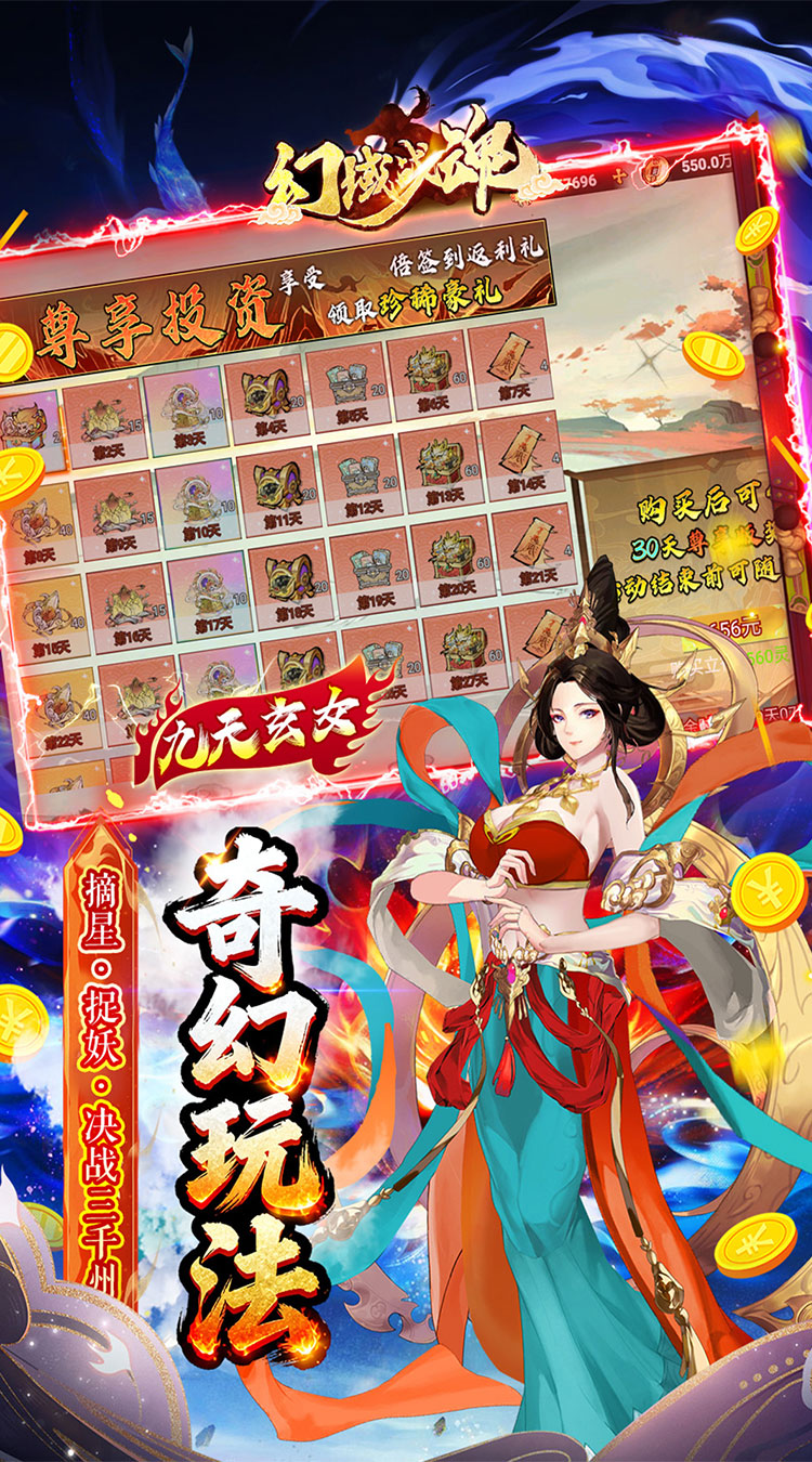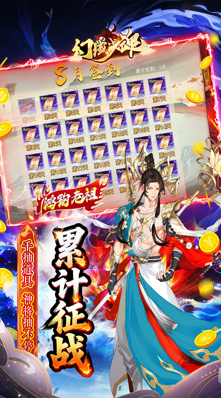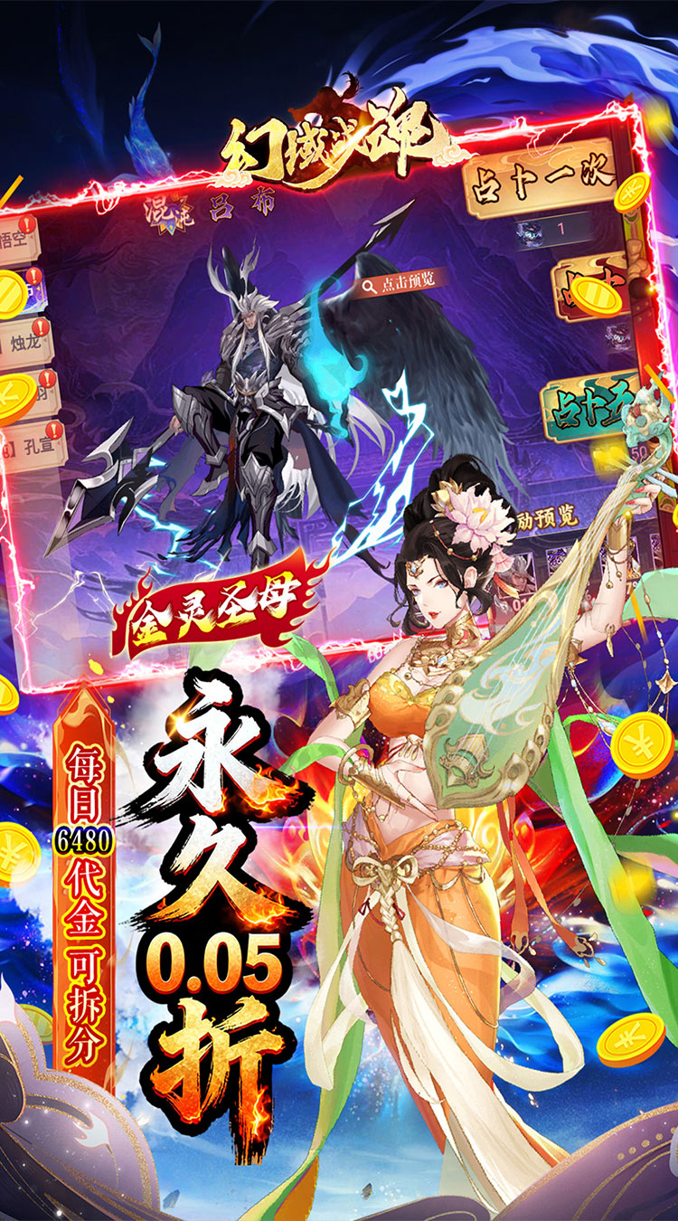 【永久0.05折】永久0.05折,真实一口价,福利更多; 【创角送礼】VIP经验,神将【哪吒】,限定装扮等; 【签到送充】七日签到领千元真充红包,每日上线直送6480代金券; 【代金返利】全新福利,累计充值每天都能领取超值代金券返利; 【满星神将】完成主线送毕业满星神将-丹江口话事人【杨戬】; 【千抽大奖】累计征战获取1000张召唤道具;