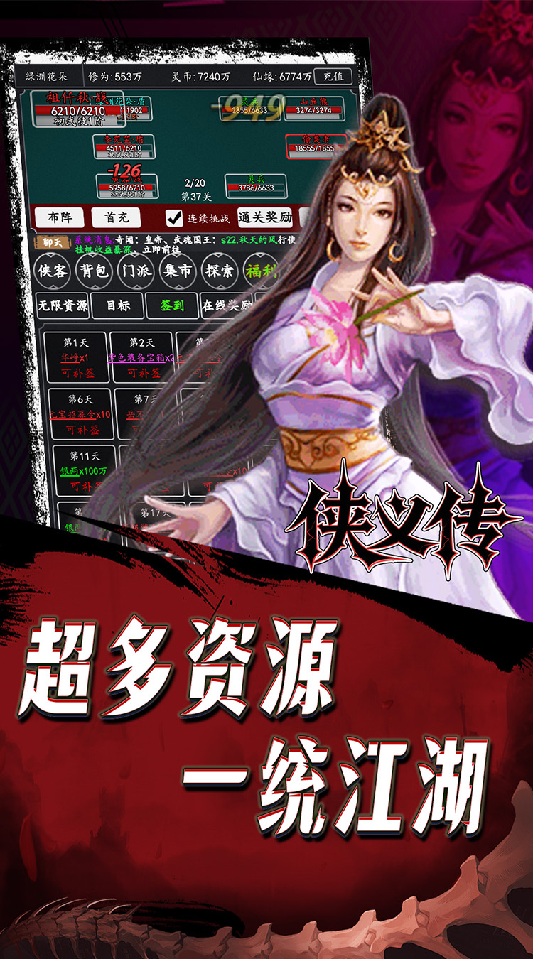 1、全场物价锁定永久0.05折,江湖畅玩无负担,消费轻松无压力! 2、登陆即领取专属称号、元宝招募令*100、6666W元宝、6666W银两、500W修为和5000W至尊灵液、秘笈碎片*6666、圣物碎片*6666、红色稀有侠客任选*1、红色秘笈任选*1,开局资源直接拉满,轻松开启江湖征程! 3、登录就送万元真实充值,在线还能参与万次福利抽奖,充值卡礼包无门槛领取,秒速到账不等待! 4、上线即送VIP修为卡*648,顶级VIP18特权一键全开,无需氪金就能享受满V待遇,尊享江湖特权! 5、挂机即可自动推关,轻松躺平也能进阶!离线期间收益不断,海量资源无需费力肝玩,轻松囤满背包! 6、不费肝不氪金,满满真福利!全员皆可成猛将,哪怕一分钱不花,也能登顶江湖巅峰!
