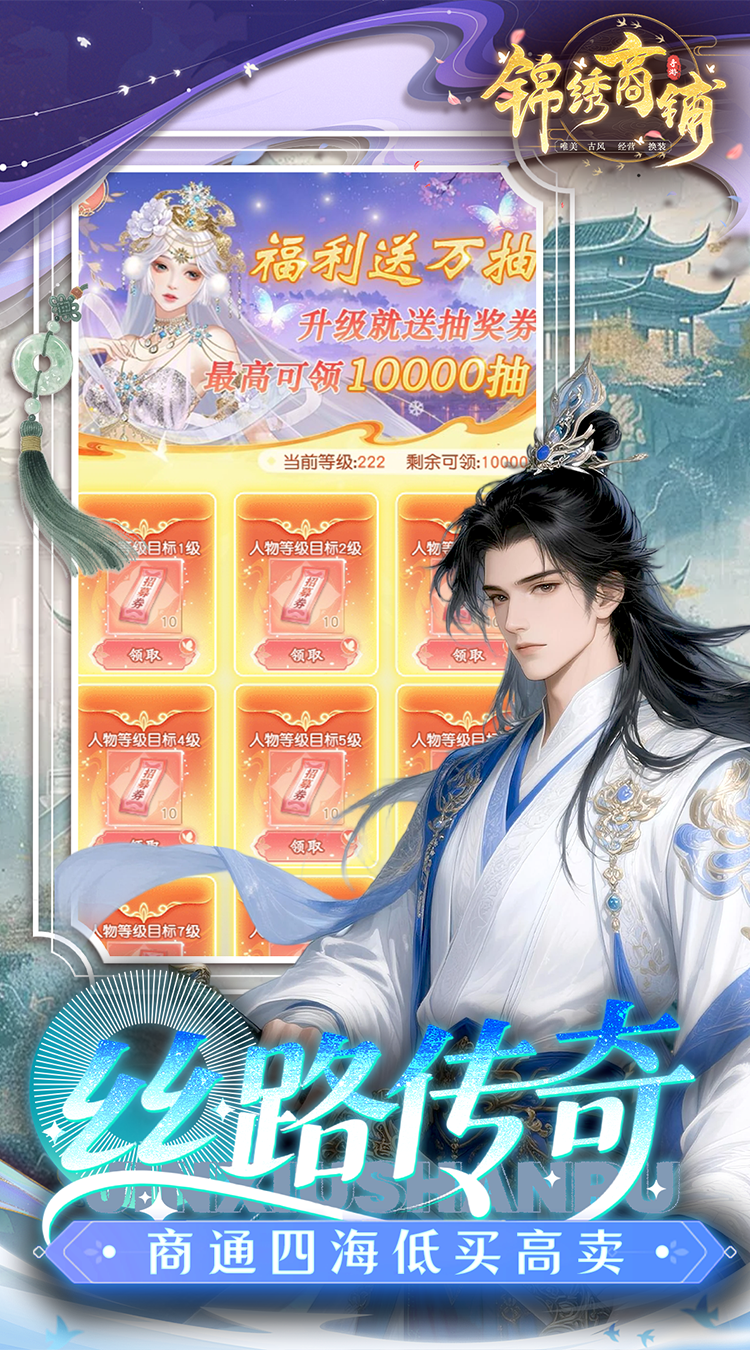 ★【进游福利】进游送66666钻石,新手送头像、相框、气泡盲盒三件套 ★【礼包福利】白手起家送橙色门客绾绾,等级升级送坐骑海棠辇 ★【海量充值】签到、活跃送万元充值卡、每日在线领千元充值卡 ★【抽充大礼】升级送10000抽,签到、七日登录送2500元真充卡 ★【贵族福利】开局送至VIP8,免费激活V1-V8所有特权 ★【经商之道】完成赚钱目标可获得海量真充卡,真充卡可升级VIP ★【合成特技】天命系统开启充值卡合成真充卡功能,轻松满V不是梦 ★【定制传闻】商海沉浮一战成名,全服广播,巨星霸屏 ★ 全场充值0.1折,充值648元仅需6.48元