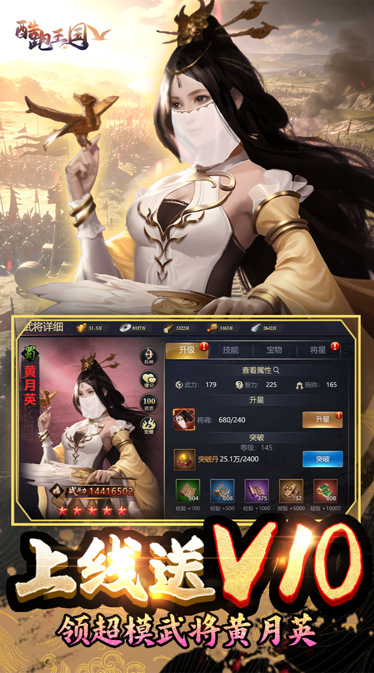 上线福利: 登录即领:上线就送V10,持续在线还可以领红将黄月英,更有绝世技能石相送,助你开局攻城拔寨。 在线/离线挂机:离线也能累计资源,上线一键领取,轻松不肝。 首充礼遇:超值首充解锁稀有红将赵云,更有价值88888元宝豪礼相送。 限时活动:节日/版本活动周周上新,参与可得稀有武将、限定专属武将宝物等丰厚奖励。 成长基金:小额投入,长期高倍返还,伴随君主等级提升持续领取,越玩越划算。