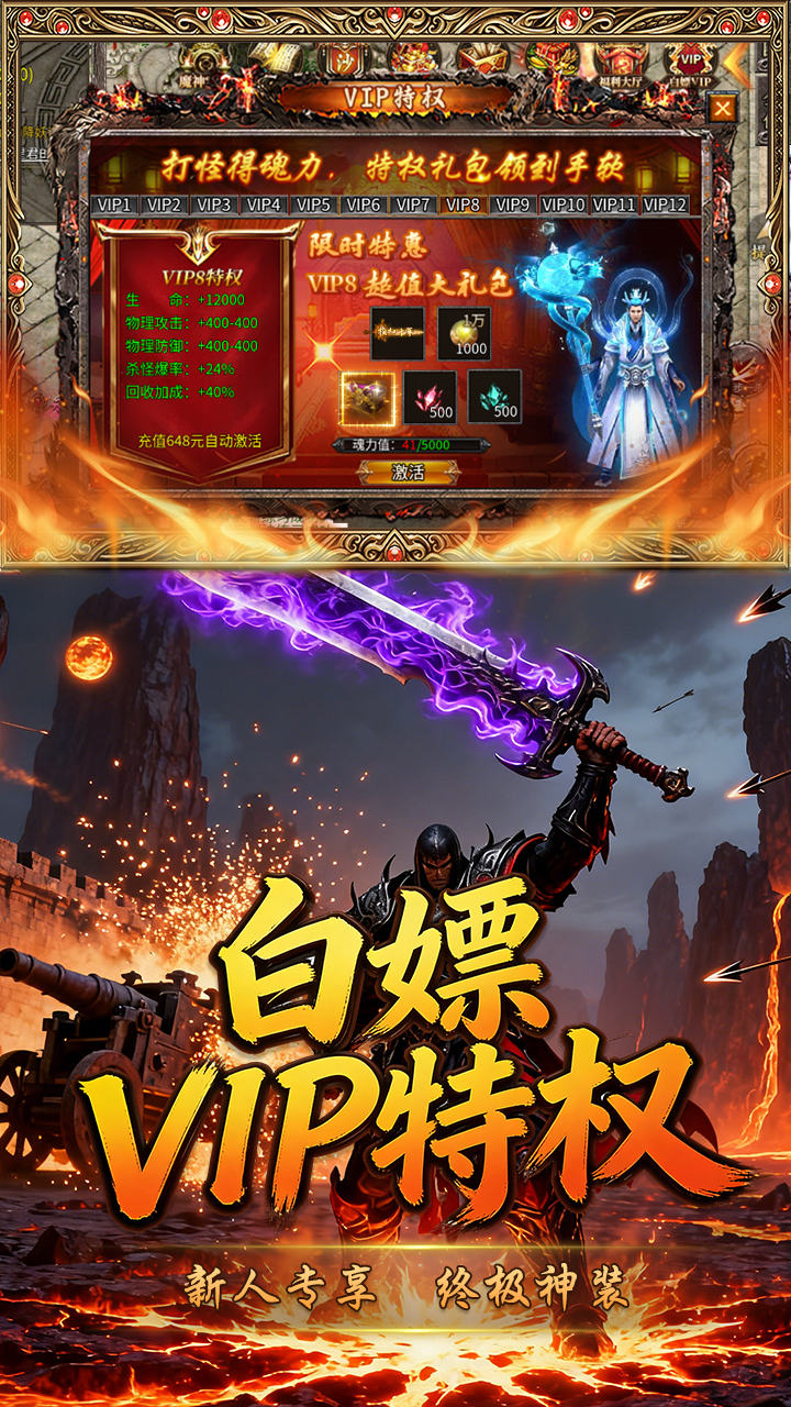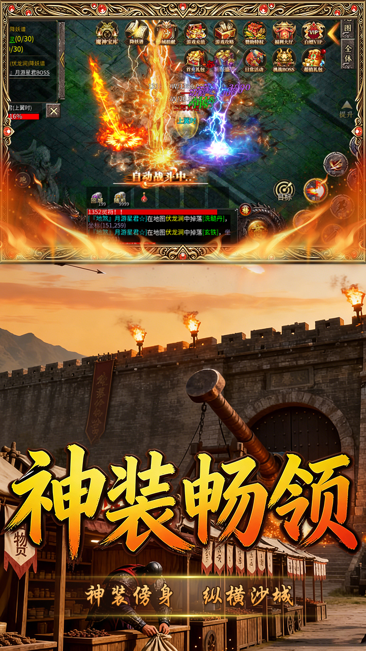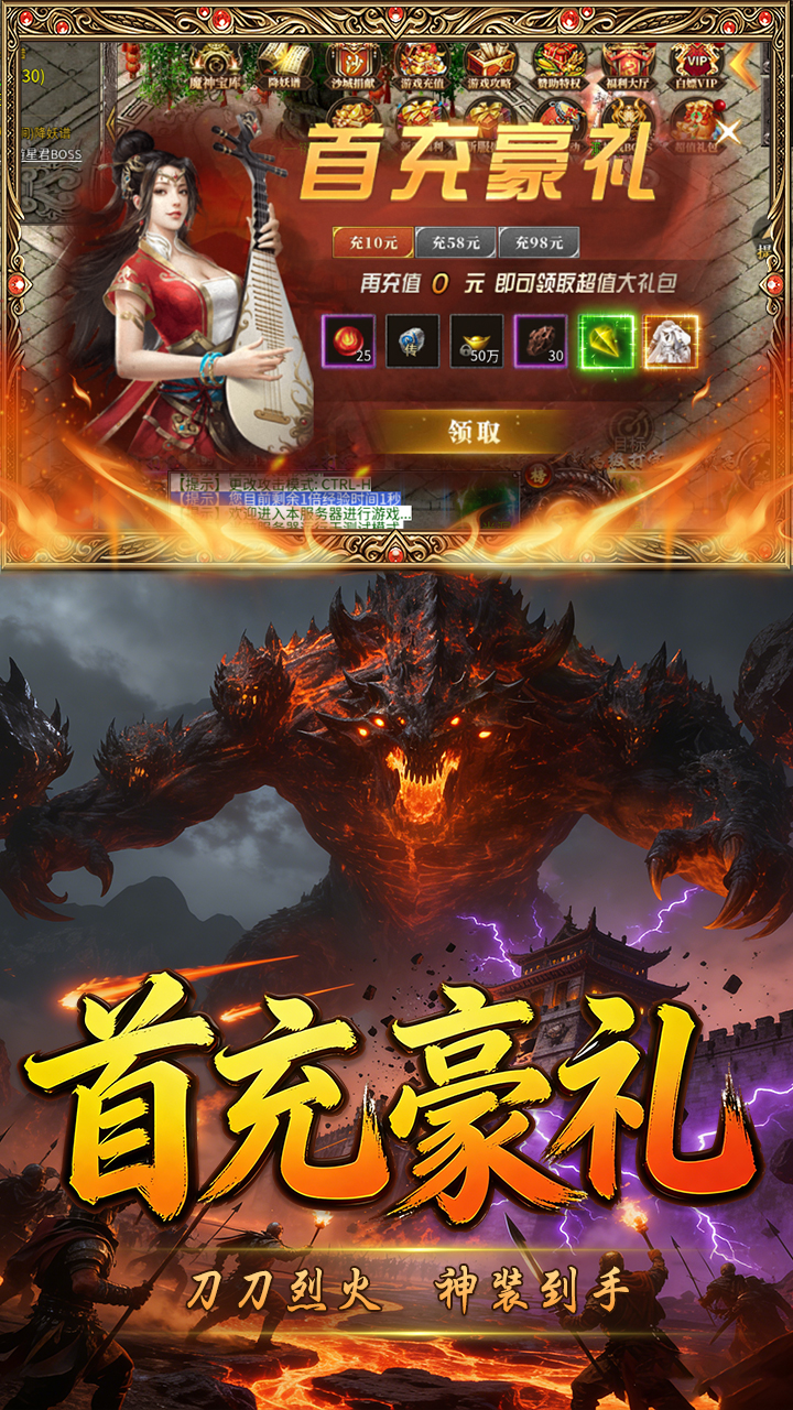 ★连续登录-限定称号 炫酷坐骑 每天百万元宝! ★每日签到-极品奖励领不停! ★装备全靠打,小怪爆终极!神器直接爆! ★击杀BOSS-史诗超变高爆率!零氪也能做大佬! ★线上线下活动双重出击不停歇,福利满满! ★线下充值返利,装备/元宝拿到手抽筋。线下限时礼包,让你一步登顶!