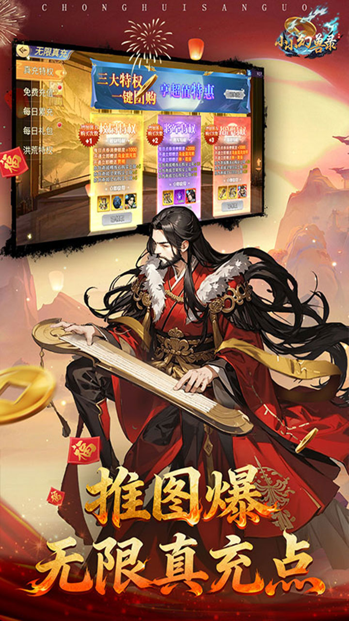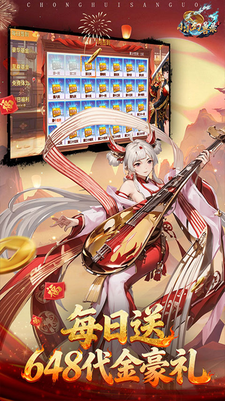 1.全场充值0.05折,648元充值仅需3.24 2.每日648元代金券送不停,每日首充再领一次 3.闯关送无限真充,轻松激活专属礼包 4.闯关送千抽,四阵营名将等待你的召唤