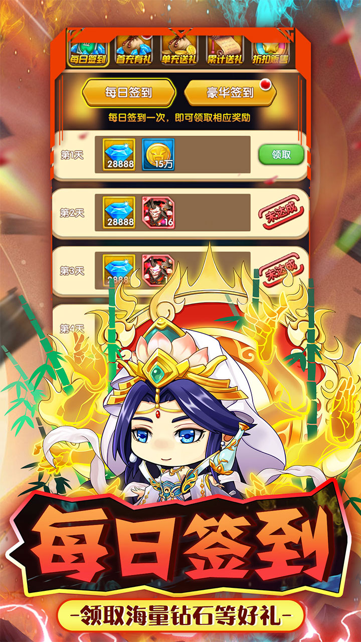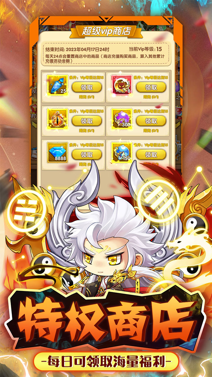 上线福利:vip15、888888钻石 1.创角即送满V、888888钻石 2.每日上限赠送648代金券,不花钱也能充到爽! 3.开服七日登录送豪礼,顶级阵容等你拿! 4.开服狂欢每日福利登录即送,幻彩英雄免费拿! 5.会员专属礼包每日免费领取 6.上线即满V、特权免费解锁