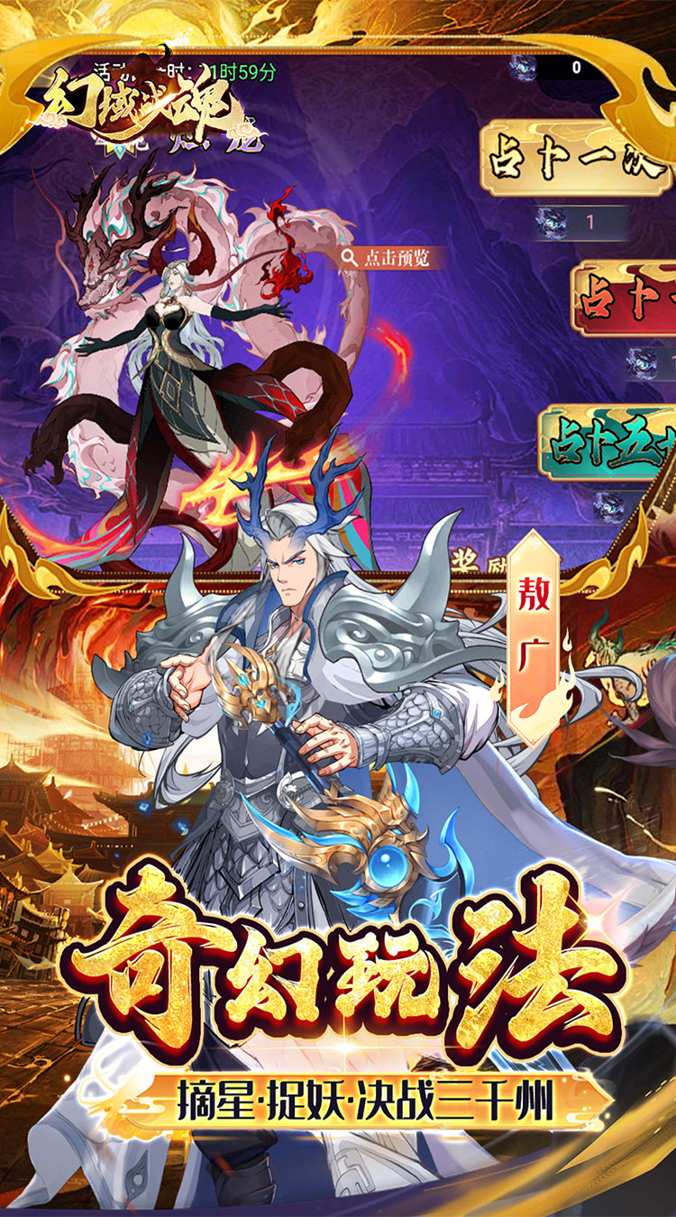 【永久0.05折】永久0.05折,真实一口价,福利更多; 【创角送礼】VIP经验,神将【哪吒】,限定装扮等; 【签到送充】七日签到领千元真充红包,每日上线直送6480代金券; 【代金返利】全新福利,累计充值每天都能领取超值代金券返利; 【满星神将】完成主线送毕业满星神将-丹江口话事人【杨戬】; 【千抽大奖】累计征战获取1000张召唤道具;