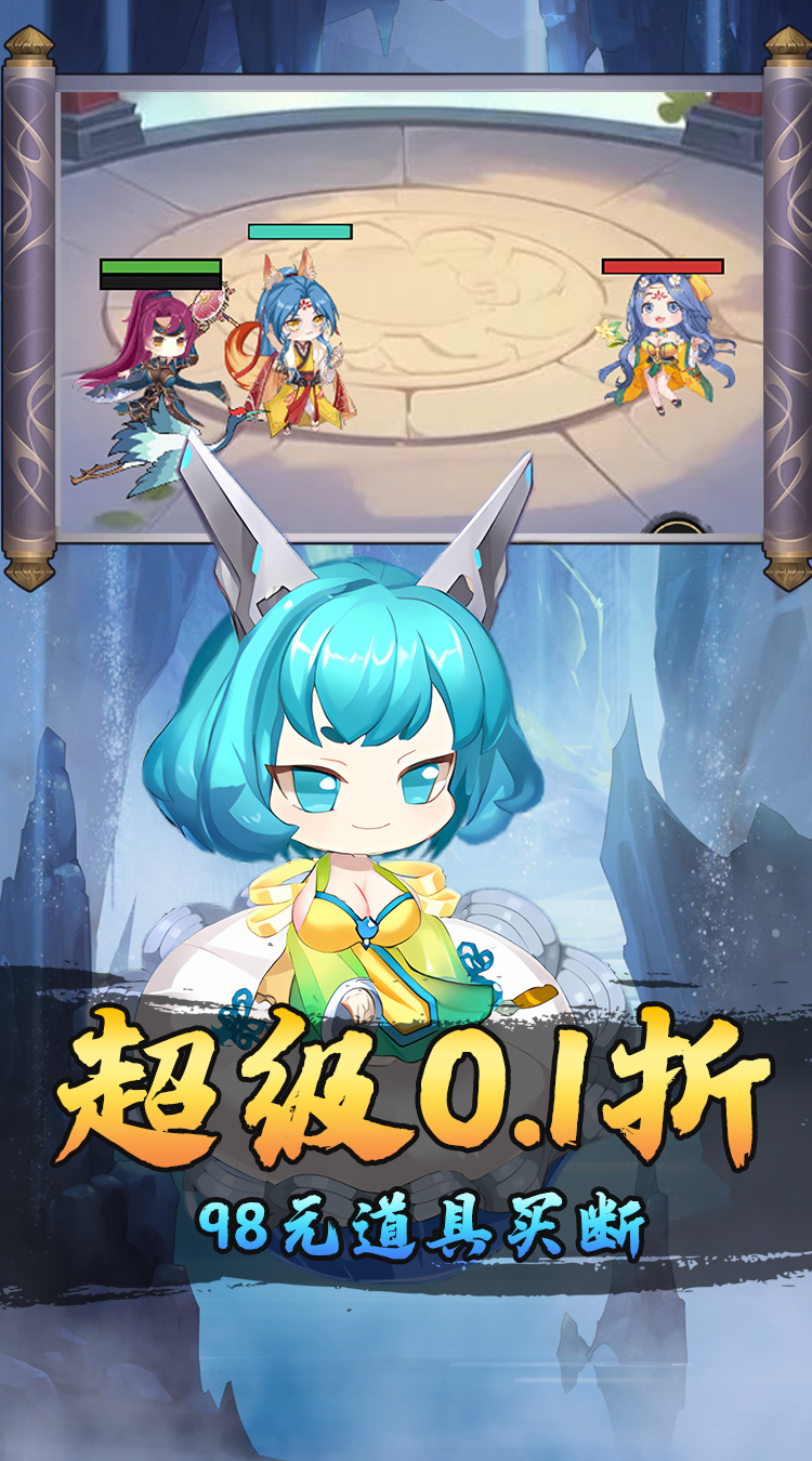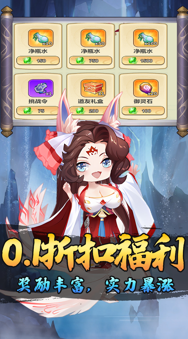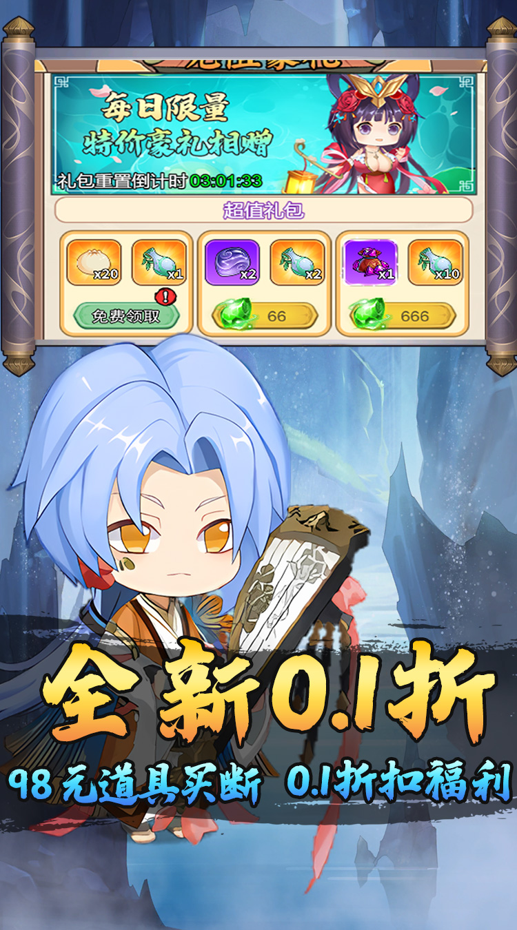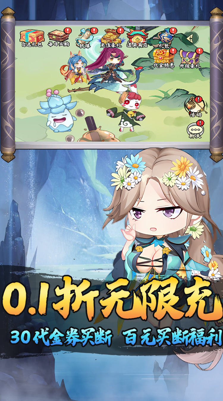 ★全场充值0.1折扣,充值比例1:10 ★进入游戏可以免费领取6480代金卷 ★签到福利:签到灵石材料领不停! ★超值终身卡:每日领取巨额元宝,激活一键扫荡特权轻松完成副本
