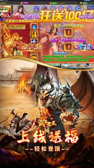 1.送超级冠名、全屏拾取、自动回收、超强切割! 2.送千倍爆率、首充大礼、炫酷时装、海量货币! 3.直购爆满地,散人也能吃肉! 4.一包烟玩到顶,真正打造散人称王新超变!