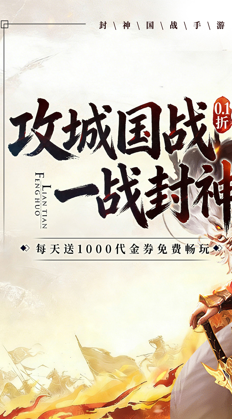 ★游戏内所有充值享永久0.1折福利; ★免费福利:游戏内每天登录免费领1千代金券; ★七日登录送自选红将,累计签到领海量资源; ★大地图闯关,城池收复获取丰厚奖励; ★全新体验,封神题材策略攻城国战游戏0.1折随心畅玩;