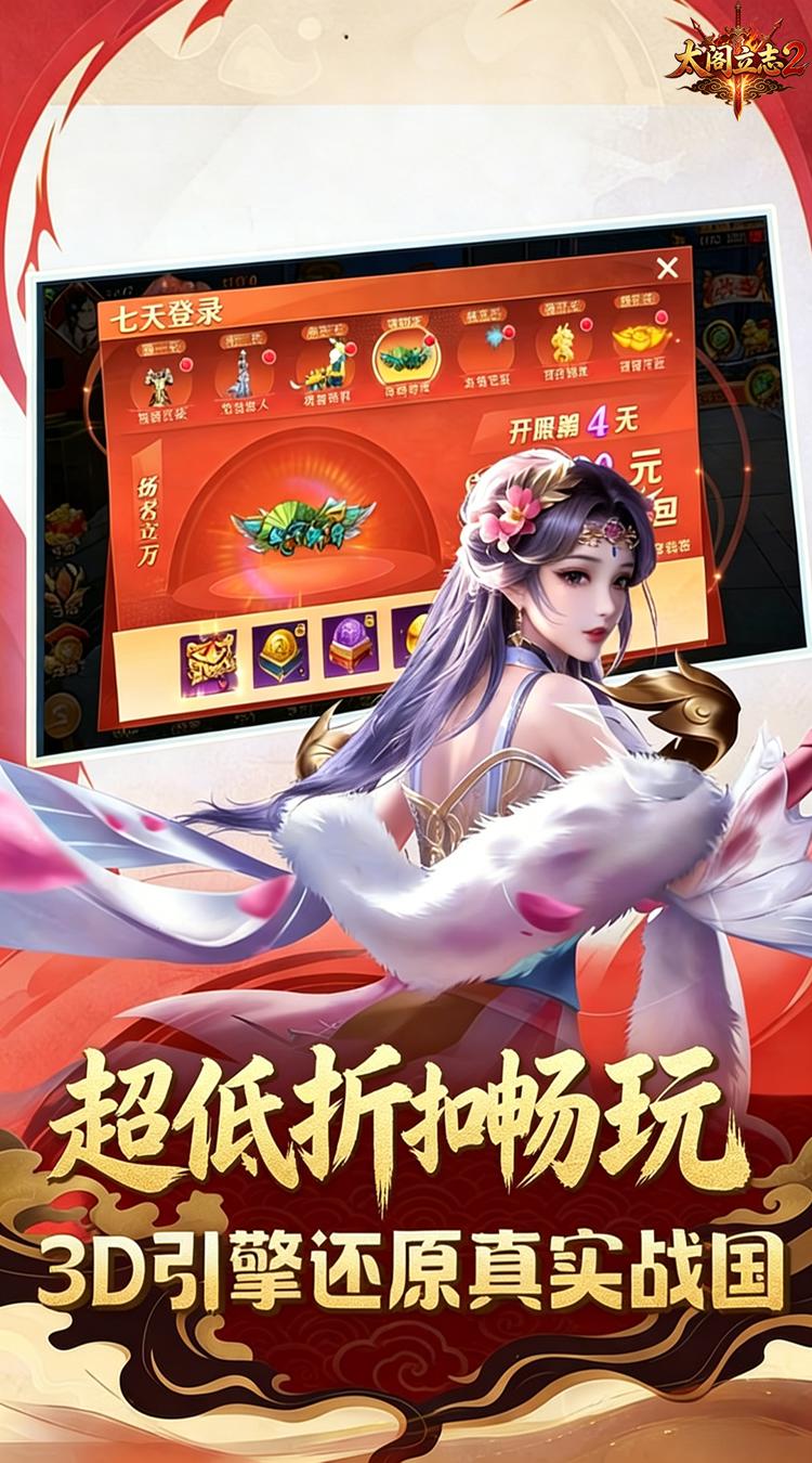 3:7天狂欢,豪华盛宴:连续7天登录,天天都有惊喜!极品红装、倾世美人、珍稀坐骑,元宝拿到手软