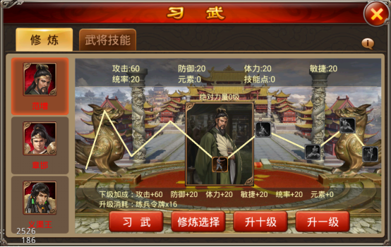 2.修炼有攻击、防御、敏捷、体力四种成长方向,每个武将可以同时修炼;