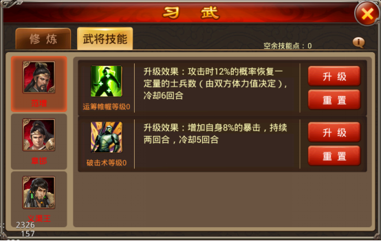 6.武将每修炼十级可得一技能点,四种修炼方向均可提供技能点;