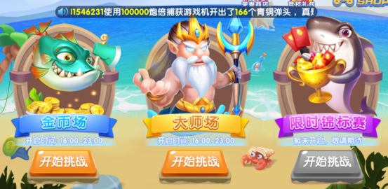 在游戏大厅界面看有选择竞技场进入游戏,竞技场目前分为金币场和大师场两种,竞技场每天时候开启时间的哦,只有在开启时间内才可以进入的呢!每日首次进入金币场和大师场是免费的,再次进入时需要消耗竞技令牌或者大奖赛邀请贴方可进入,竞技令牌看有通过在渔场内击杀鱼概率掉落,随着当天进入的次数越多,每次消耗的竞技令牌也越多