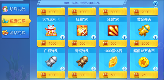 弹头道具也可以通过游戏内的限时活动来获取,例如游戏内的勇士屠龙活动,使用道具攻击龙,即可有几率获得弹头道具奖励;也可以在礼品商城使用珍珠加金币或者鱼券来兑换弹头道具哦,不同的弹头道具需要兑换的物品数量也是不同的哦!
