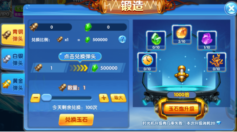 游戏内的渔场分为两种,一种是消耗金币进行游戏的渔场,另外一种就是消耗玉石进行游戏的渔场,金币的获取方式有很多,下面就跟大家介绍下玉石如何获得玉石可以通过在金币渔场击杀鱼有概率掉落玉石奖励,也可以通过弹头道具进行玉石兑换,使用弹头道具兑换玉石可以在玉石传说房间入口处,点击锻造按钮,进行弹头道具兑换成玉石,也可以使用玉石兑换成弹头道具。玉石场的炮倍和金币场的炮倍是不同的哦!在玉石场使用炮倍越高,击杀BOSS以及其他鱼类获得的玉石以及弹头奖励也越多。