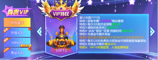 每个等级对应VIP均可在游戏内领取专属VIP炮台奖励,炮台是永久的哦,而且每个月VIP用户都可以领取幸运礼包的哦,VIP等级越高奖励也是越丰富!