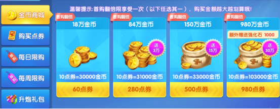 不容错过的就是金币商城内的首购翻倍了,这是唯一一次充值可以获得双倍奖励的礼包了,礼包也分为不同的档次,可以根据自身条件去购买礼包,只有第一次购买礼包是翻倍,购买金额越大越划算哦!游戏是有VIP等级设置的哦,不同等级的VIP每日领取的奖励也是不同的哦!