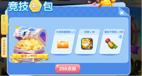也可以通过在游戏内购买竞技礼包领取大奖赛邀请帖来进入游戏,每次进入竞技场子弹数是固定的哦,购买竞技赛礼包是可以增加进入竞技场的初始子弹数量的哦!根据单次进入竞技场获得的积分不同,进行依次排名,排名前100名的玩家都可以获得丰富的奖励哦!
