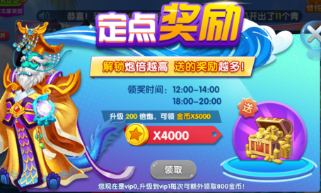 游戏大厅右侧的免费金币处,每天的日常签到以及固定时间段可以领取的定点奖励也不要错过哦,定点奖励根据炮倍大小,炮倍越高获得的定点奖励也越高哦!