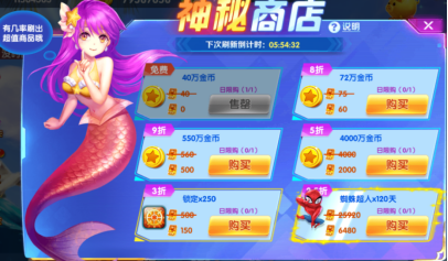 达到一定等级VIP的玩家即可解锁神秘商店,神秘商店会限时出售各种折扣物品,非常大的优惠力度,除了金币以及道具奖励外,还会有概率刷新到稀有炮台以及翅膀哦,每日还有免费的礼包可以购买,VIP玩家不容错过哦!