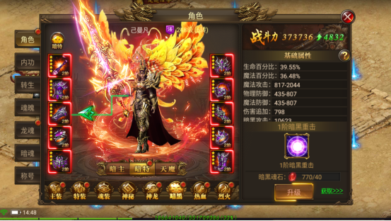 1. 暗魂有10阶,每阶10星, 升级可获得特殊属性;
