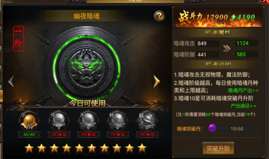 6. 暗魂10星可消耗暗魂突破丹升阶,突破丹可以通过商城购买或者暗黑个人副本获得