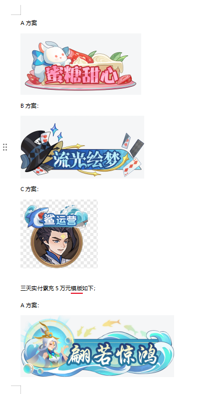 2、游戏内充值达到相应档位后,A方案、B方案和C方案只能选择其中一个申请领取,不可重复或者多次申请领取。充值达到高档位可以申请低档位的称号。