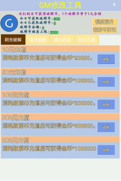 送GM破解器:GM工具,闯关获得破解器余额,余额可在工具内提取充值,获得对应货币,还能购买首充礼包,每日礼包获得海量道具!