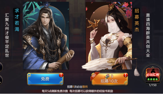 每天一次免费招募,10连必出整将,招募令可通过每日任务、主线任务、商城和限时活动获得,武将池不定期更新一波稀有武将,武将主要产出途径