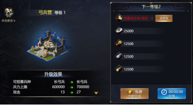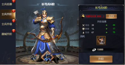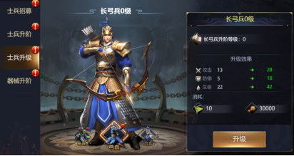 士兵可大幅度提升武将战力,士兵养成包括士兵升阶、士兵升级以及兵营升级