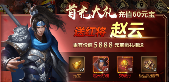 前期可利用系统赠送的金将紫将可稳定度过新手期,中后期再根据招募到的稀有武将重组阵容,武将养成资源不够可通过重生功能重置闲置武将,要想先人一步可购买首充礼包、1元金将礼包或君主礼包,首充6元即可获得120资质超强武将赵云,微氪玩家可以酌情考虑,等级、武将领先而且经济实惠