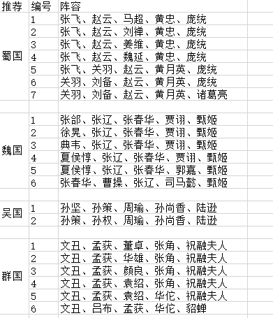 非酋玩家可尽量凑齐双国家队,最好3蜀国配2可激活国属武将(其余国家,根据实际情况选择),蜀国武将比较容易获得,如马超、赵云这类武将都是可以一直使用,双国家队阵容参考如下