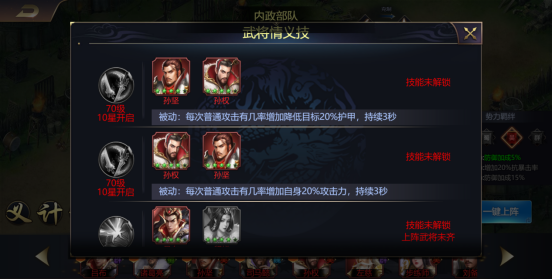 武将资质越高,技能强度越高,武将通过升级、升星解锁被动和开场技能。