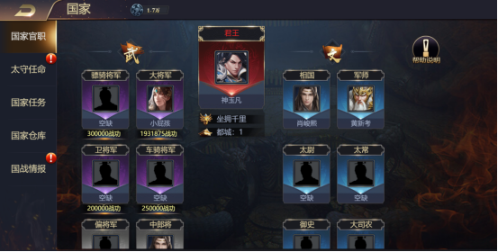 国不可一日无君,玩家通过参与国战天下大势玩法攻打指定城池,每个阶段战功最高者自动加冕为国家最高官职,统领文武百官!武官可通过获取战功获取对应官职,文官可通过最高官职任命!不同官职拥有独特的特权!国家官员各司其职,管理国家!