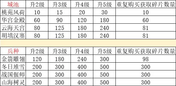 八、兵种皮肤以及城池皮肤升级所需碎片消耗数量是多少?
