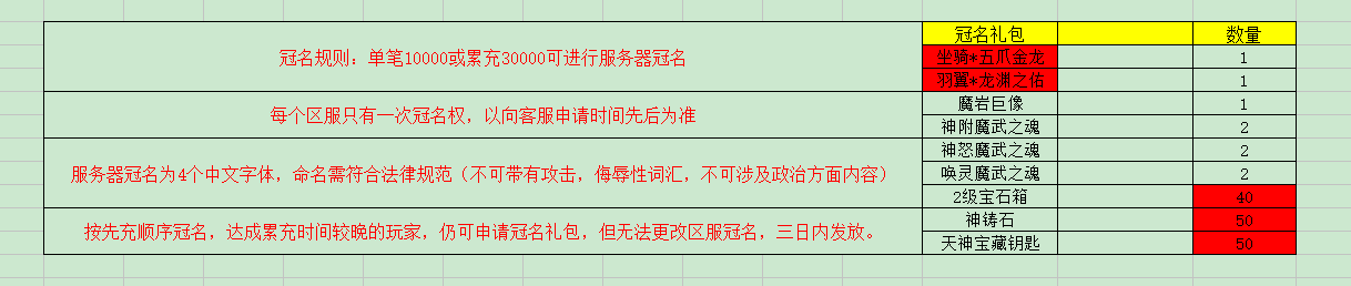 1000 神铸石*20,天神宝藏钥匙*20,战骑之魂*10,神兵祝福油*10,背饰精华*10,2级宝石箱*8,个人首领挑战令*4,梦境粉尘*4,天使果实*5,冥想替身(6小时 )*3,炽火炎石*6,传说魔武碎片*50,金币*30w