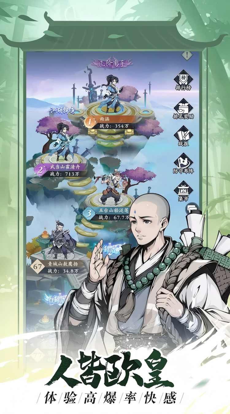 ·最全武林:让你重回武林世界,体验最全门派阵容搭配,感受最真实江湖。 ·佛系挂机:不用秃头也能赢,体验杯酒斩断江湖的酣畅淋漓。 ·策略放置:惊喜不断的奇遇,丰富的随机事件,耐人寻味的探寻背后事情真相。 ·保护非酋:酒逢知己千杯少,酒馆结识专属自己的独门侠客,集满图鉴不是梦。