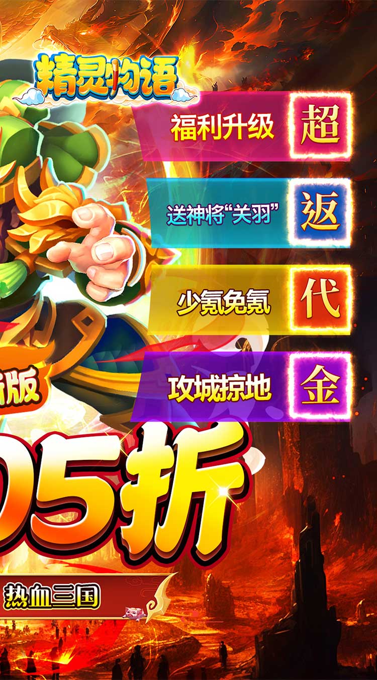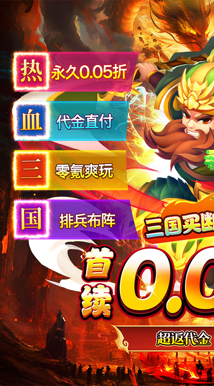 【三国0.05折】开局即享0.05折永久充值,三国放置手游,轻松畅玩; 【红包兑换】每日红包兑换无限送!真充拿到手软! 【七日狂欢】七日等级送顶级7星神将“关羽”,先发制人,决胜千里; 【新角好礼】创角赠送7星猛将“张辽”,千万货币; 【乱世三国】召唤武将,排兵布阵,攻城掠地,热血三国,携手并进,角逐国战;