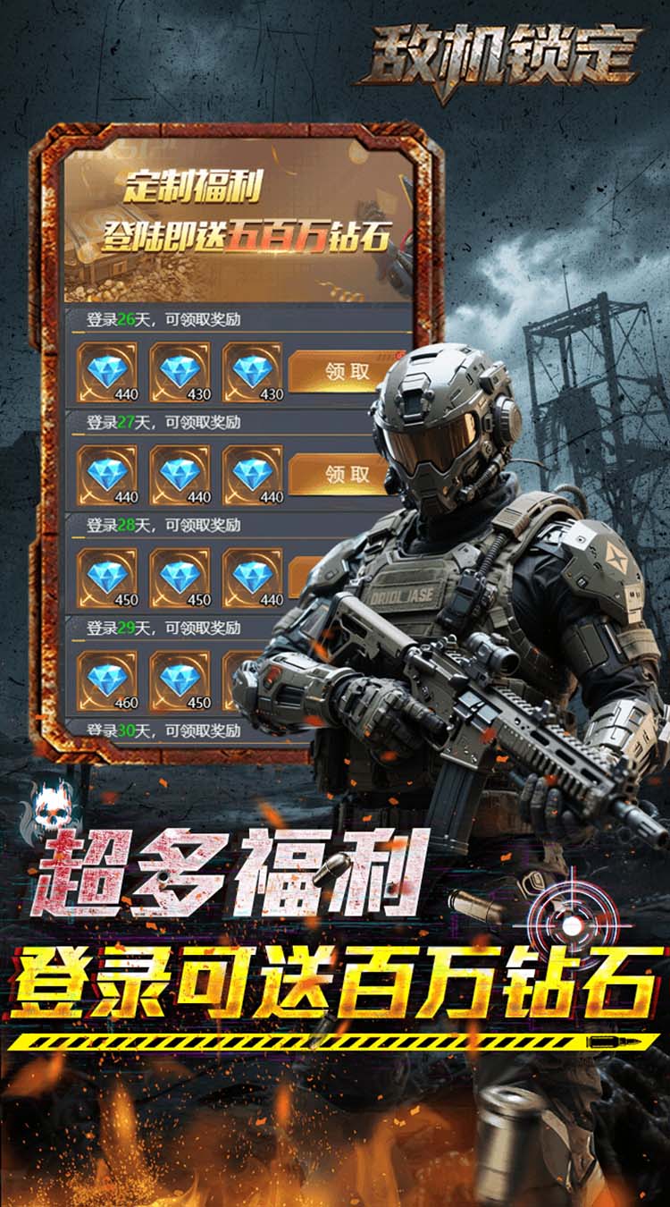 1、登录可送百万钻石,让你疯狂买买买 2、闯关可送VIP10,还有海量福利大赠送 3、每日签到还有极品枪械以及时装领取,豪礼送不停 4、全场充值只要3.5折,福利多多
