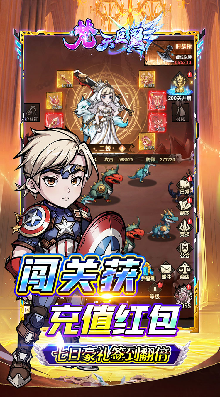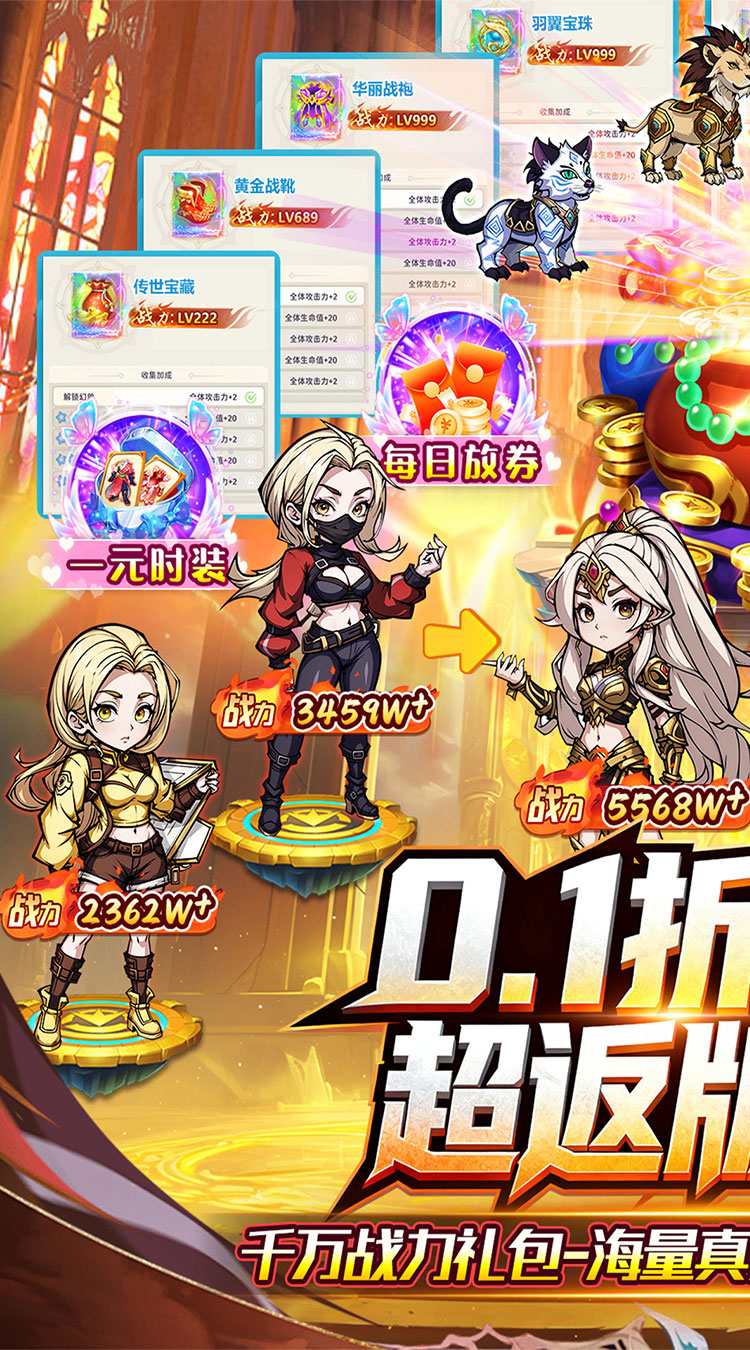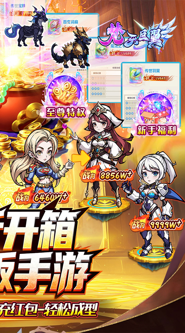 【永久0.1折】全场永久充值0.1折,不膨胀,648只需6.48; 【每日648】每天登陆即可领取折前648元游戏现金券,购买游戏内一切礼包; 【真充红包】游戏内即可获取大量充值红包,使用后获得丰富货币和VIP经验; 【七日福利】轻松领取千万战力礼包,打怪升级,快人一步; 【探索冒险】卡通风格画面,色彩丰富,场景细腻,为玩家呈现一个梦幻般的冒险世界;