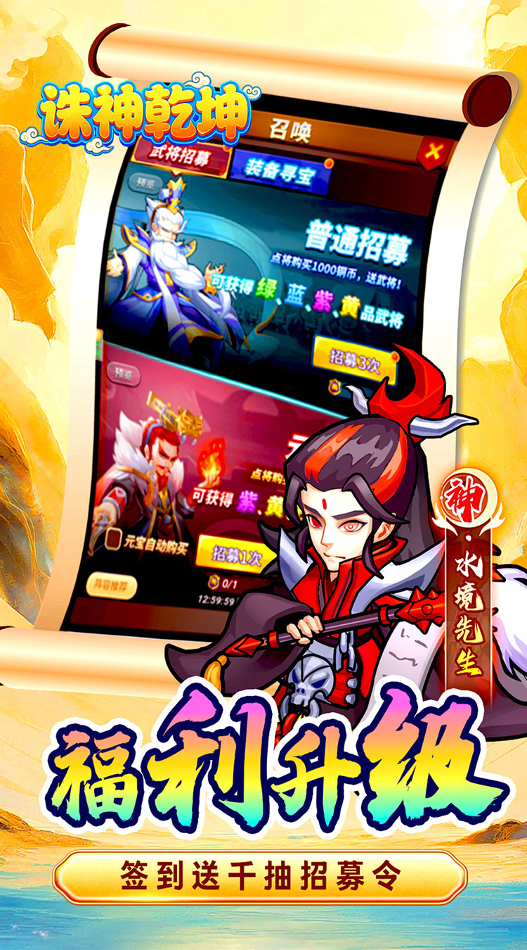 ★★【永久0.05折】0.05折永久代充,拒绝数据膨胀; ★★【无限代充】每日签到领3W代充劵,无限白嫖充值; ★★【起号福利】创角送200W代充券,神关羽+红品神装 ★★【等级豪礼】30级免费领取千抽福利召唤令,无限招募; ★★【摸鱼福利】自动推图,解放双手,休闲三国,摸鱼必备。