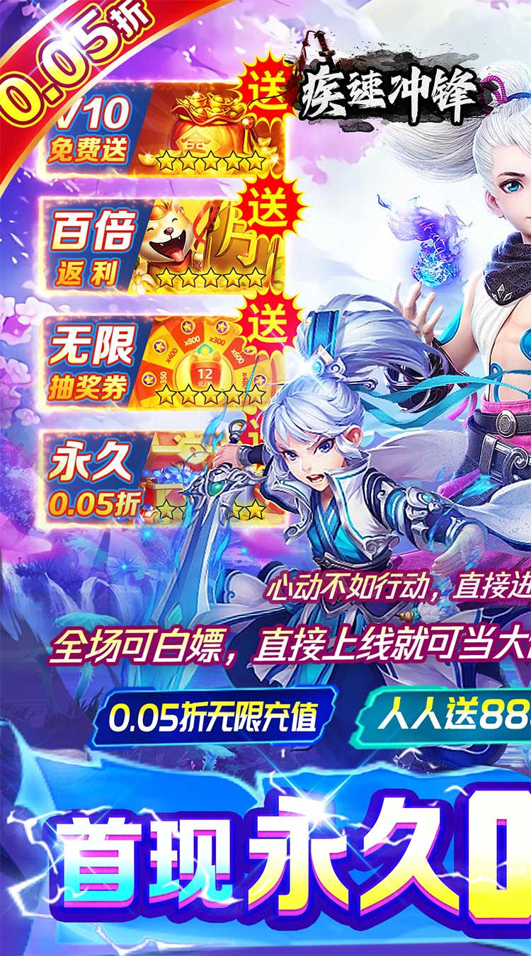★开局送VIP10 88888元宝 ★全场全部充值0.05折, ★首充低至0.05元,10倍元宝返利 ★签到领千万资源绝品神兵幻化 ★7日登录签到领元宝、稀有时装 ★在线瓜分百万资源豪礼