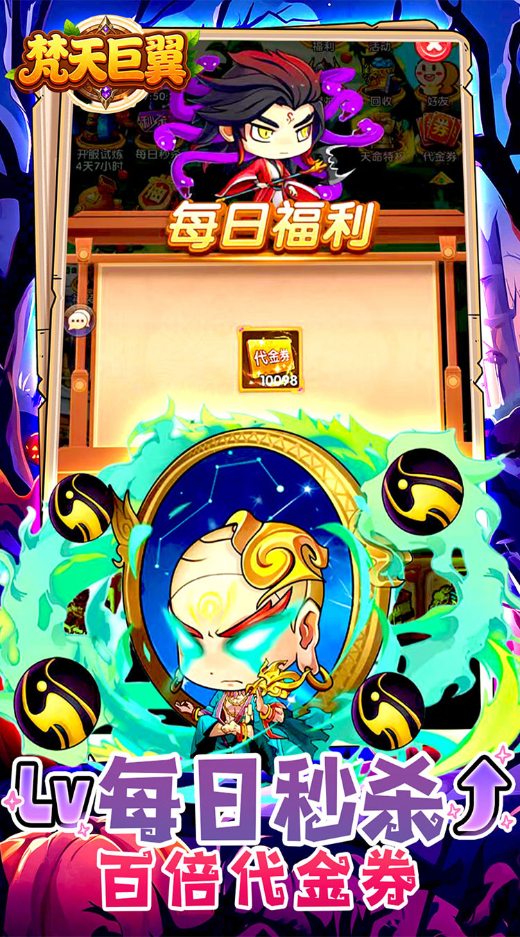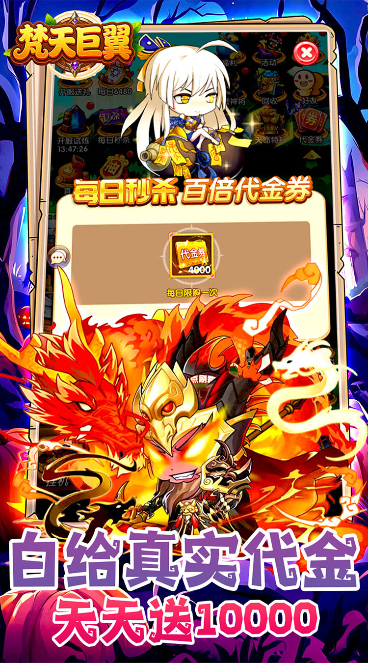上线福利: ★上线豪礼,上线赠送菩提老祖、代金券、钻石、金币!! ★每日福利,每日免费领取10000代金券!! ★开服豪礼,每日登录领取豪华连抽!! ★每日秒杀,百倍代金券!! ★登录福利,累计登录送无双英雄!!