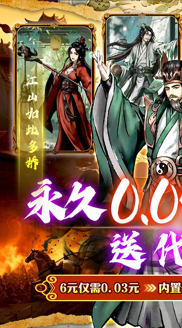 福利★:【永久0.5折】充值比例1:10,轻松畅玩; 福利★:【免费代金券】每天登录直送万张代金券,一爽到底; 福利★:【无限资源】无限资源购买叠加,一次买断,无限领取; 福利★:【免费充值】可在充值页面直接使用充值额度支付,福利加倍; 福利★:【免费千抽】通关主线免费千抽,顶级红将任选; 福利★:【开箱三国】趣味三国,即休闲又养生,行侠仗义,过关斩将;