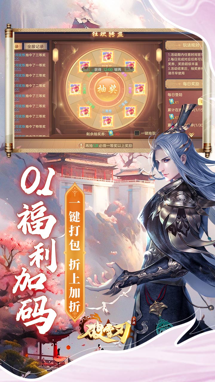 1、全新0.1折万元免费版,游戏内每日免费领10000代金! 2、礼包码wy6480专属加赠:领取进入游戏内背包每日免费开6480代金! 3、代金狂欢转盘福利:每日活跃免费再抽5000以上代金,制霸三界,指日可待! 4、进游礼包福利直送限定豪华外观,破雪春归/爱心魔毯/披紫云香! 5、代金返现再加码,福利无限升级,最高单日可返现500万无门槛代金券!