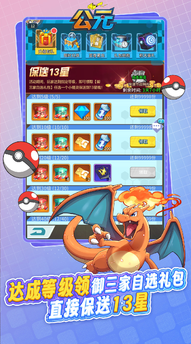 1.登录有礼·传奇旅程即刻开启: 首日登录:即刻领取闪亮登场的5星伙伴——皮卡丘!与你一同开启友谊的篇章! 次日登录:获得创世之神——5星阿尔宙斯!体验执掌创世之力的非凡起点! 第七日登录:直接赠送50元充值卡!助力你的冒险之旅一飞冲天! 第八日登录:再送强力神兽——阿尔宙斯!用于突破升星,让你的创世神傲视群雄! 2.开服助力·御三家伴你同行 冒险途中,等级提升至关重要!达到指定等级,即可领取丰厚的【御三家自选礼包】!你可以选择自己钟情的初始伙伴(妙蛙种子/小火龙/杰尼龟),我们将直接保送它至13星!告别培养烦恼,让你心爱的御三家从起步就拥有巅峰战力,成为你队伍中最可靠的核心王牌! 3.超值首充·神兽伙伴轻松得 首充0.1元:立刻获得坚不可摧的5星神兽——雷吉斯奇鲁!用一根棒棒糖的钱,为你的队伍筑起钢铁长城! 充值满1元:再添一位强大战力,解锁电系强者5星神兽——雷煌(雷公)!以雷霆万钧之势横扫赛场!